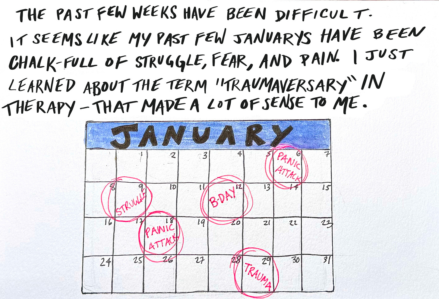 [ Alt text and Image description: “The past few weeks have been difficult. It seems like my past few Januarys have been chalk-full of struggle, fear, and pain. I just learned about the term “traumaversary” in therapy — that made a lot of sense to me.” An illustration of calendar reading January, with a handful of days blocked off for things like “trauma”, “panic attacks”, and “struggle”. ]