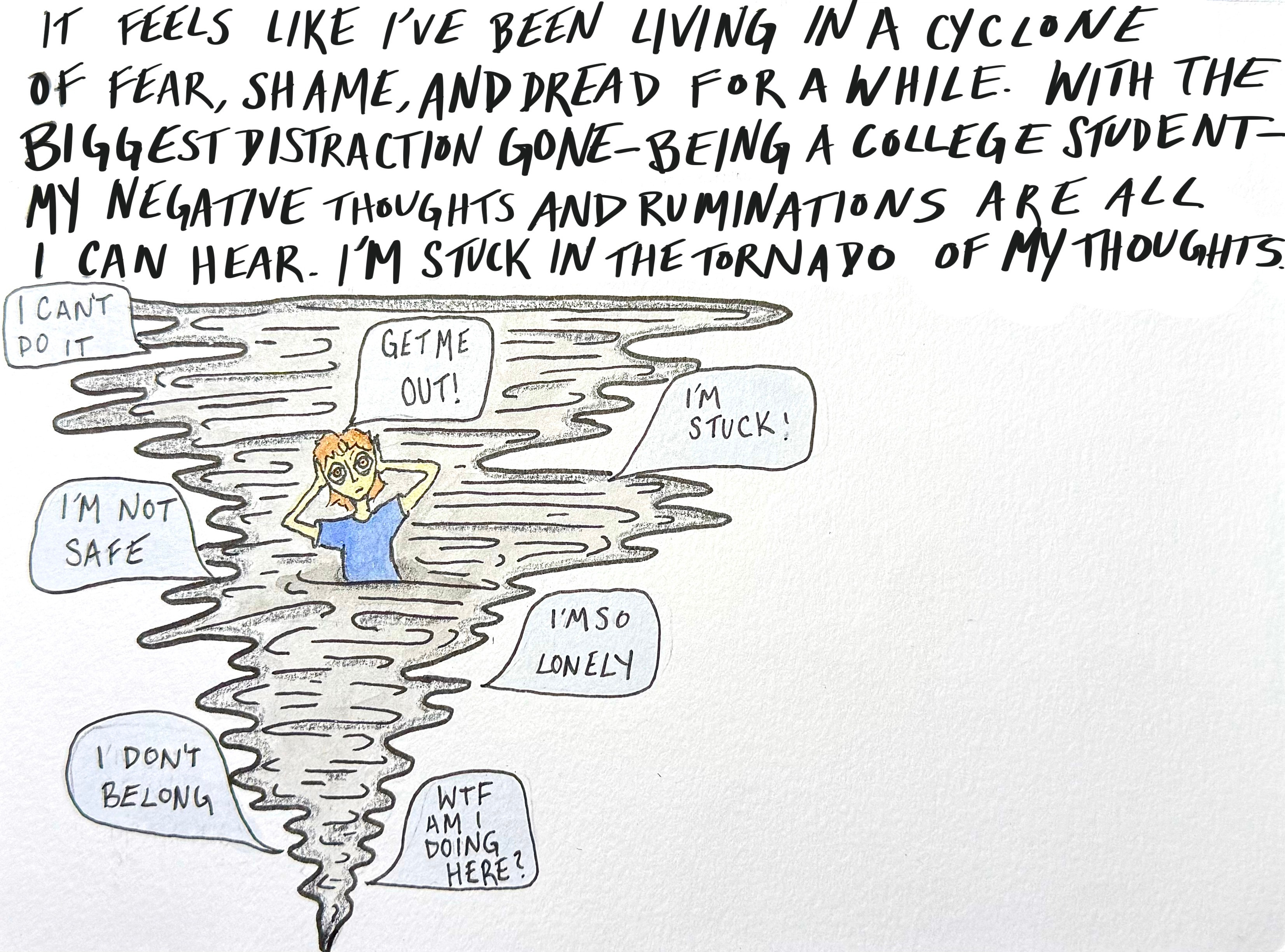 [ Alt text and Image description: “It feels like I’ve been living in a cyclone of fear, shame, and dread for a while. With the biggest distraction gone — being a college student — my negative thoughts and ruminations are all I can hear. I’m stuck in the tornado of my thoughts.” An illustration of myself within a tornado, speech bubbles conveying negative thoughts like, “Get me out!”, “I’m not safe”, and “I don’t belong”. ]