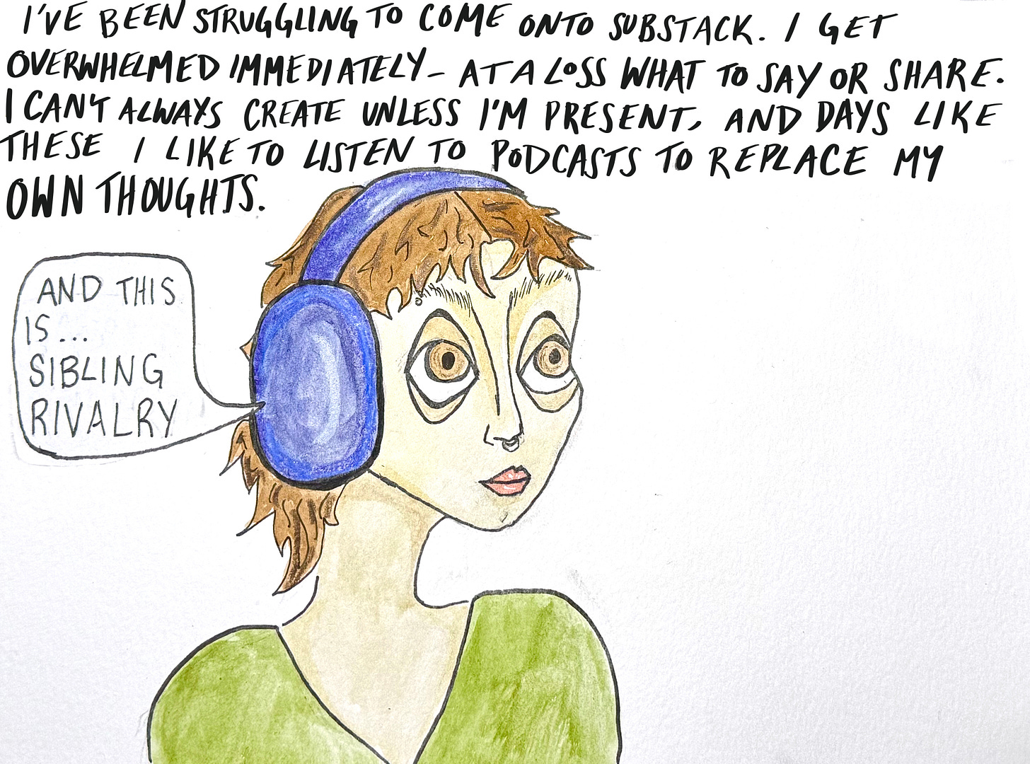 [ Alt text and Image description: “I’ve been struggling to come onto Substack. I get overwhelmed immediately — at a loss what to say or share. I can’t always create unless I’m present, and days like these I like to listen to podcasts to replace my own thoughts.” An illustration of me with my headphones on. A speech bubble comes out of the headphones that says, “And this is… Sibling Rivalry”. ]