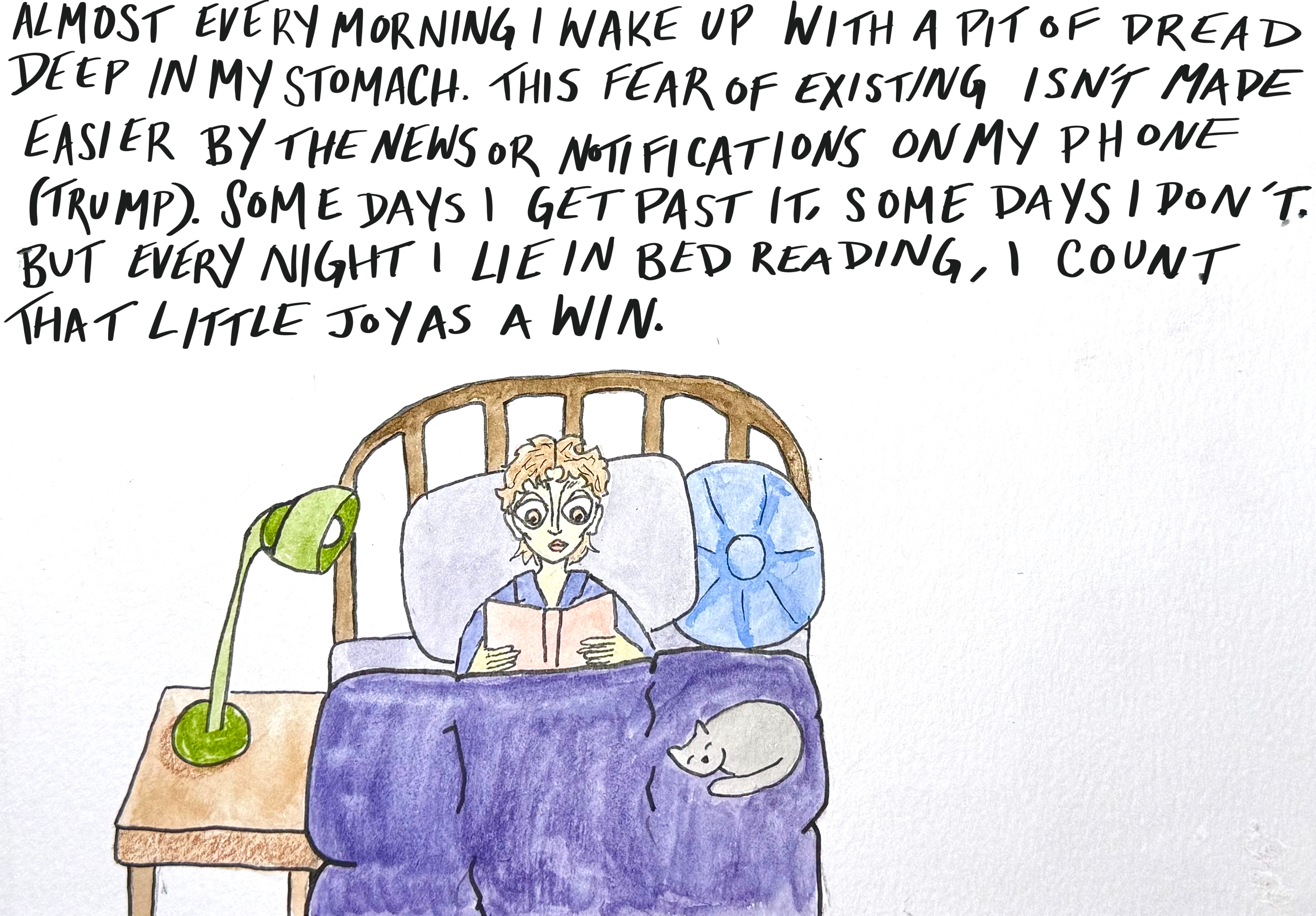 [ Alt text and Image description: “Almost every morning I wake up with a pit of dread deep in my stomach. This fear of existing isn’t made easier by the news or notifications on my phone (Trump). Some days I get past it, some days I don’t. But every night I lie in bed reading, I count that little joy as a win.” An illustration of me lying in bed reading with my foster cat. ]