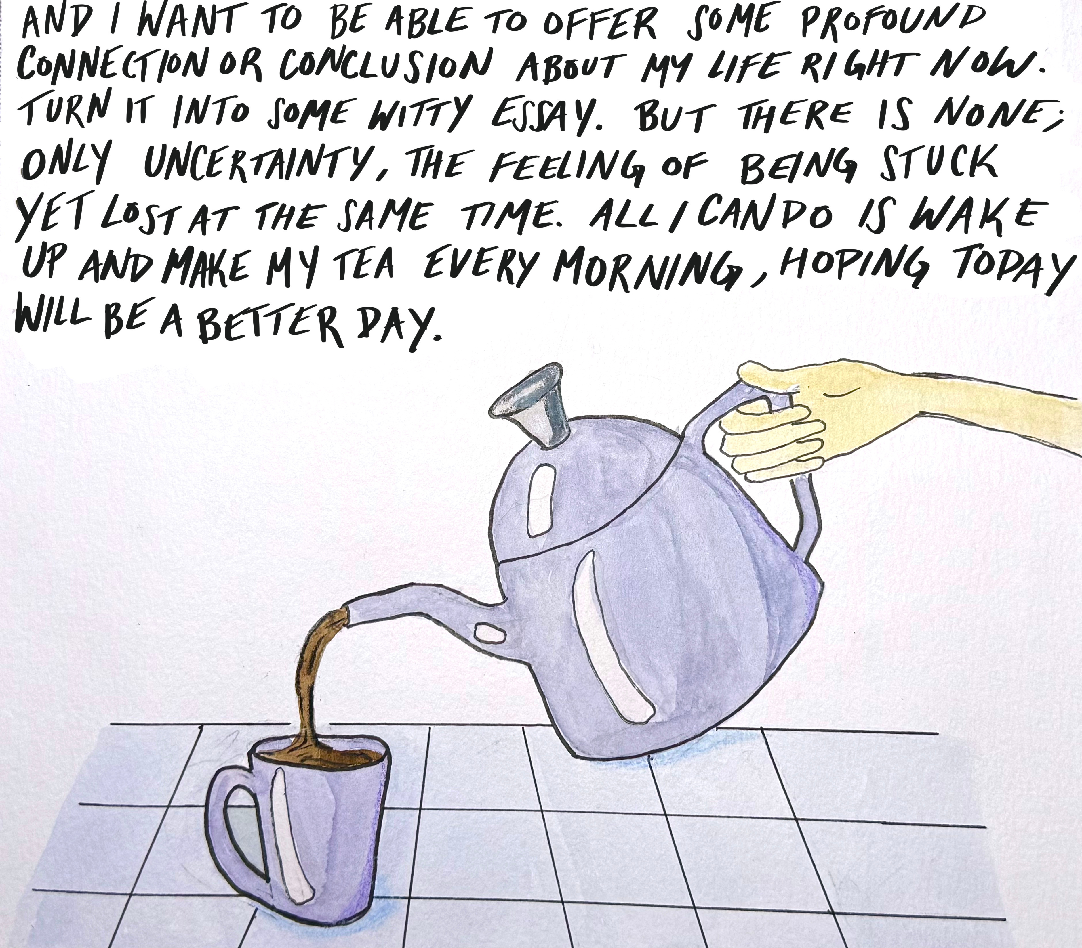 [ Alt text and Image description: “And I want to be able to offer some profound connection or conclusion about my life right now. Turn it into some witty essay. But there is none; only uncertainty, the feeling of being stuck yet lost at the same time. All I can do is wake up and make my tea every morning, hoping today will be a better day.” An illustration of a hand pouring tea from a large teapot into a mug on a tiled counter. ]
